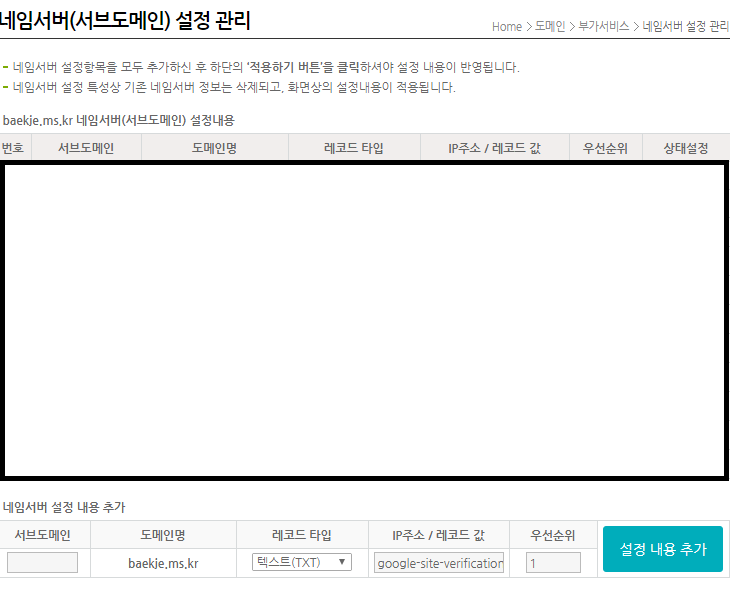여기서 값/응답/대상 부분에 google-site-verification=~~~ 부분을 전부 복사 해주시고 도메인을 구매한 곳(hosting.kr)로 돌아가 주세요.