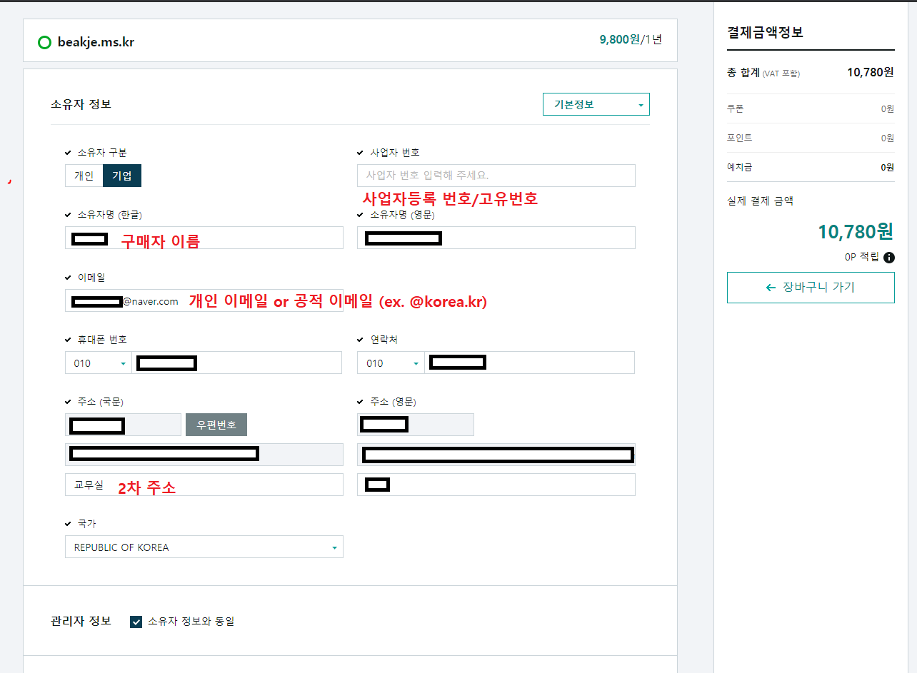 다른 학교는 모르겠으나, 저희는 방침이 도메인은 1년씩만 구매/연장이 가능하다고 하기도 했고, 마침 방학이라 행정실에 결제 맡기기도 힘들어 개인 카드로 결제했습니다.