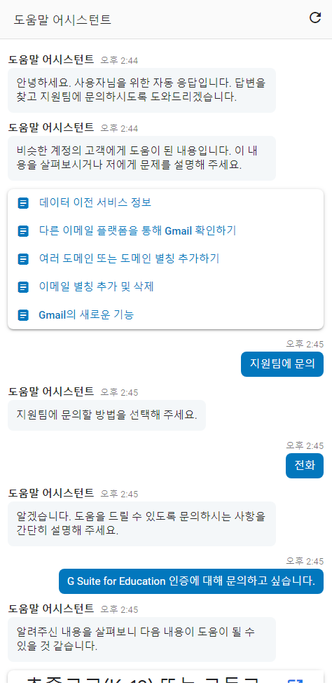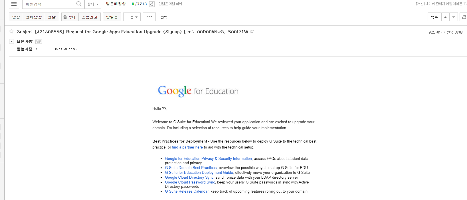담당 팀은 G Suite 무슨 팀이였는데, 그쪽 팀에 문의를 해서 'Gsuite for education을 신청했는데, 언제쯤 인증이 되는지 알 수 있나요?', '혹시 인증 시간은 얼마정도 걸리나요?' 이런 식으로 이야기를 하다보면 여기서는 처리 할수 없고, 외국 부서에서 처리하기 때문에 그쪽 부서에 관련 사항 문의를 넣어 주신다고 하십니다.
