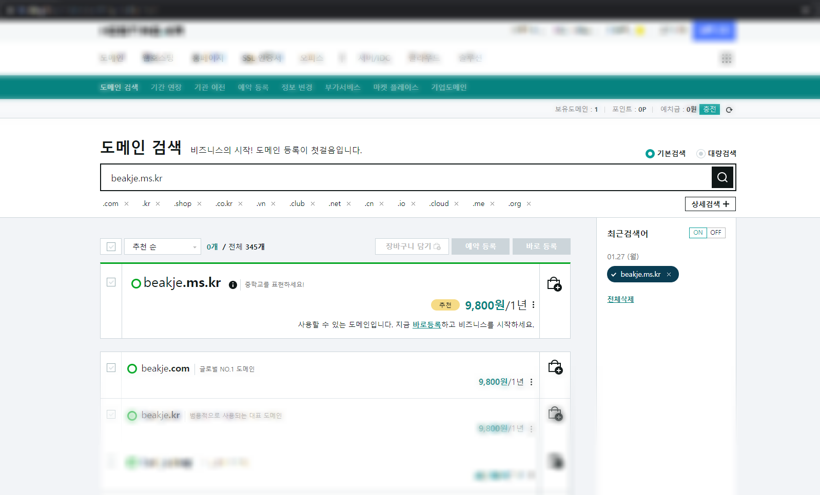 먼저 원하는 도메인을 검색하고 클릭후 바로 등록해주세요.