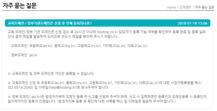 help@hosting.kr로 사업자등록증 혹은 고유번호증을 보내면 24시간 이내로 등록처리가 된다고 합니다.