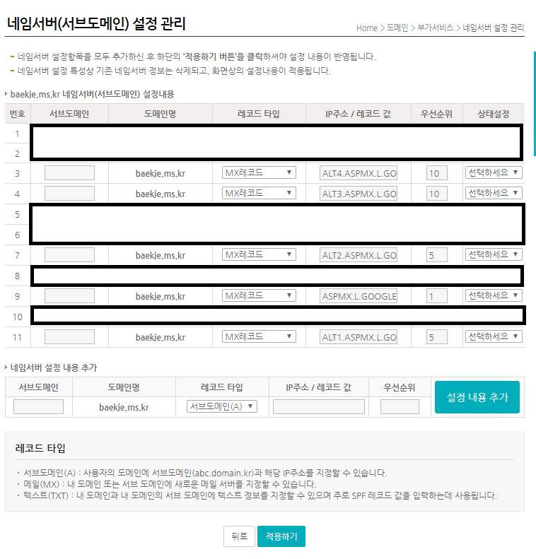 그리고 아래처럼 서브도메인은 비우고, 레코드 타입을 [MX 레코드]를 클릭하시고, 레코드 값에 위 표에 있는 '값/응답/목적지' 를 적고, 우선순위에는 상단 표에 나와있는대로 적어주시고 적용하기를 눌러주세요.
