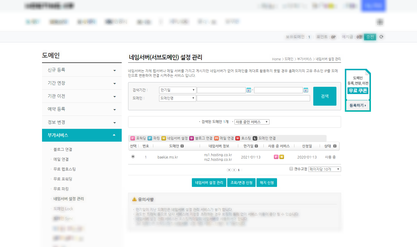 그리고 상단바에 '도메인>부가서비스>네임서버 설정 관리' 에 들어가 주세요