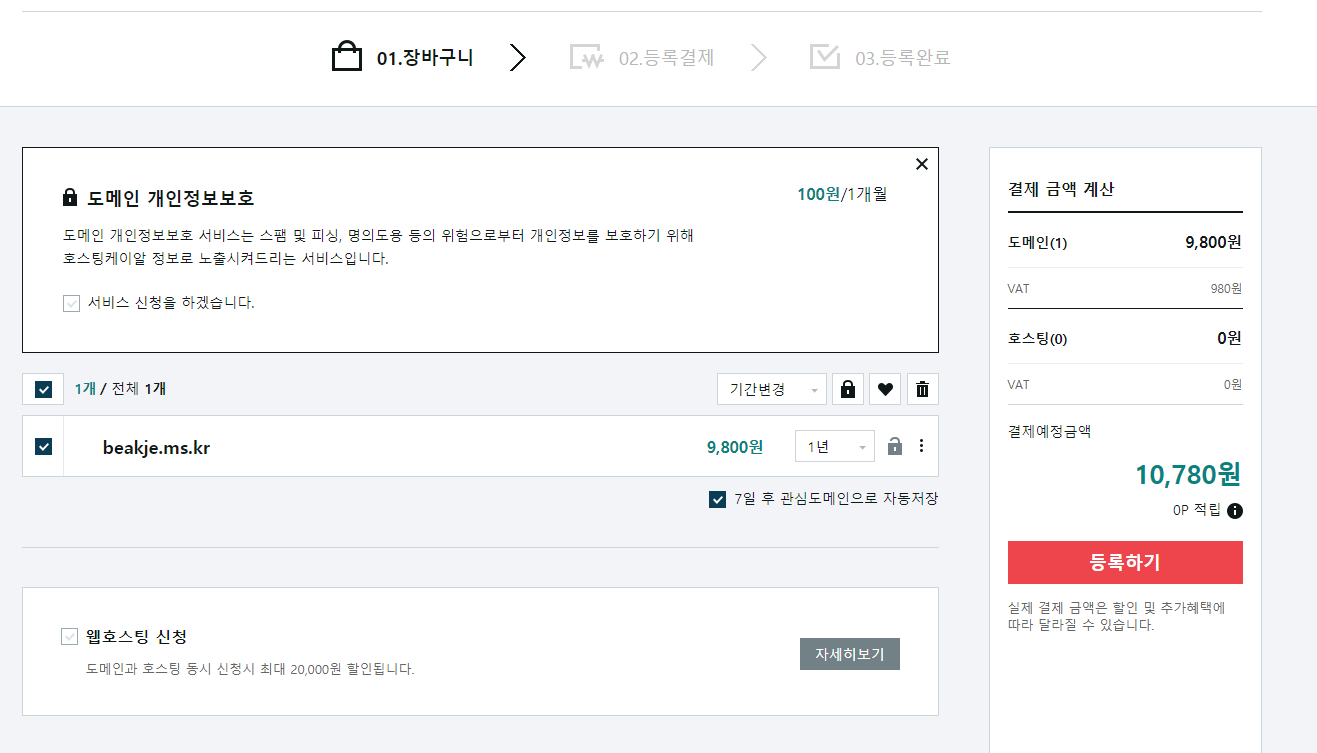 이런식으로 하시고, 카드 혹은 다른 결제수단으로 결제를 하면 도메인 구매가 끝납니다.