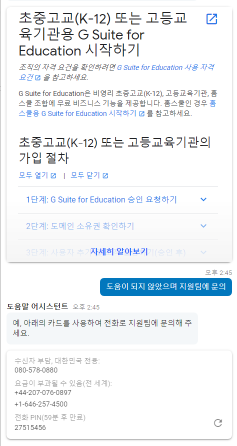 담당 팀은 G Suite 무슨 팀이였는데, 그쪽 팀에 문의를 해서 'Gsuite for education을 신청했는데, 언제쯤 인증이 되는지 알 수 있나요?', '혹시 인증 시간은 얼마정도 걸리나요?' 이런 식으로 이야기를 하다보면 여기서는 처리 할수 없고, 외국 부서에서 처리하기 때문에 그쪽 부서에 관련 사항 문의를 넣어 주신다고 하십니다.