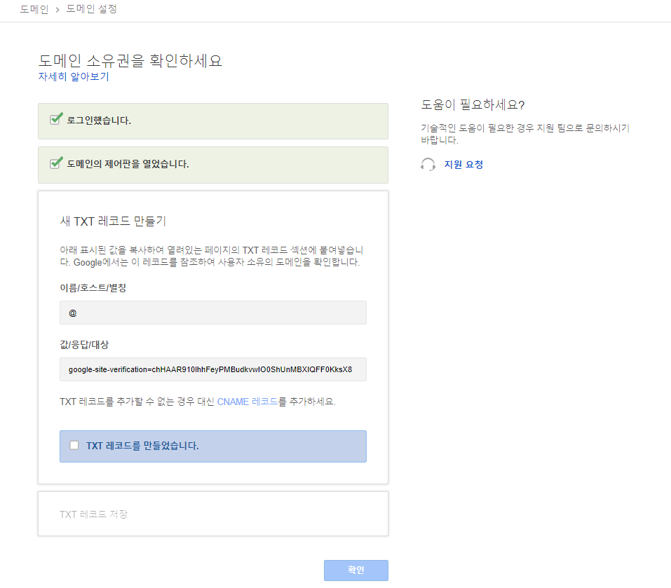 그리고 구글로 돌아와서 확인버튼을 누르면 도메인 인증이 완료 되었다고 합니다.