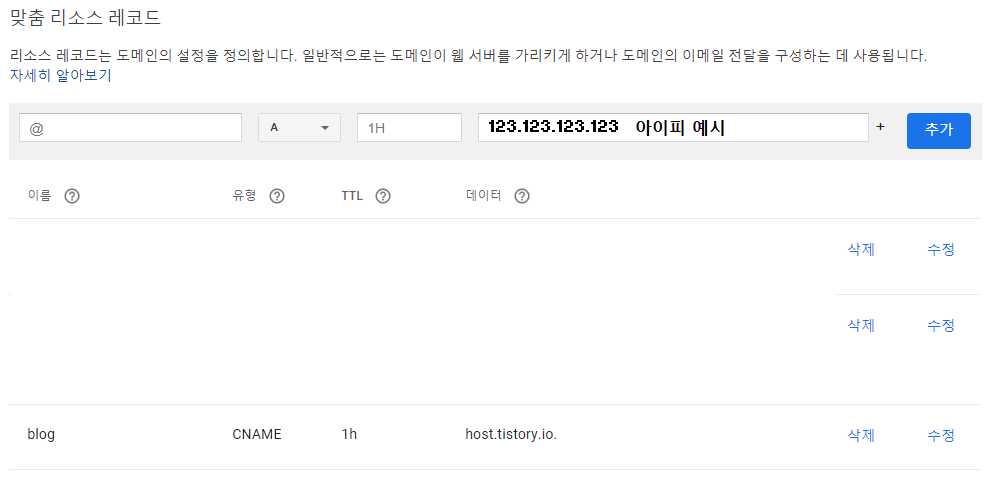 | CNAME @ host.tistory.io. | A @ [서버 아이피] |