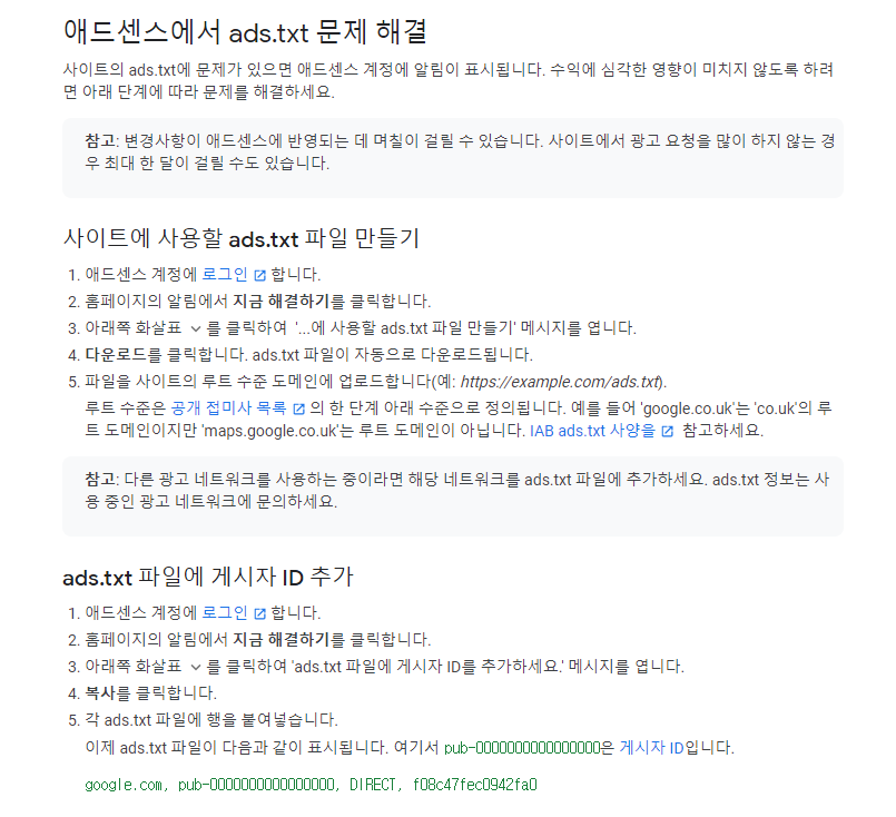 일단 이런식으로 간단하게 소개가 끝났는데, 이렇게 처리를 해주면 간단하게 ads.txt 오류를 없엘 수 있다.