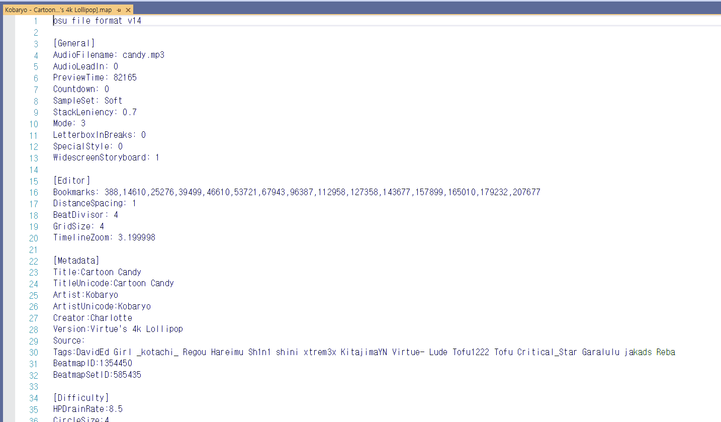 .osu is a human-readable file format containing information about a beatmap. The first line of the file specifies the file format version. For example, osu file format v14 is the latest version. The following content is separated into sections, indicated b